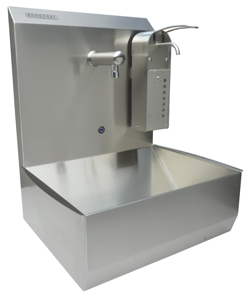 Sensorbediende handwasbak met hygiënische constructie en RVS uitloopkranen.